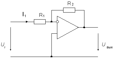 Найдем входное сопротивление схемы. Поскольку напряжение на неинвертирующем входе относительно общей шины равно нулю, согласно свойству а) идеального ОУ входной ток схемы I1 = U2 / R1. Следовательно, входное сопротивление схемы Rвх = R1. Поскольку напряжение на неинвертирующем входе усилителя равно нулю, а согласно свойству а) идеального ОУ разность потенциалов между его входами равна нулю, то инвертирующий вход в этой схеме иногда называют виртуальным (т.е. воображаемым) нулем.