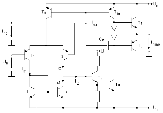 Входной каскад выполнен по схеме дифференциального усилителя на p-n-p транзисторах Т1 и Т2. В качестве нагрузки использовано токовое зеркало на n-p-n транзисторах Т3 и Т4. Для выходного тока входного каскада, следовательно, можно записать следующее соотношение: