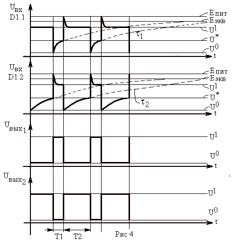 Мультивибратор собран на двух логических элементах И-НЕ (D1.1 и D1.2) с двумя времязадающими конденсаторами С1 и С2 (Рис 3). Время T1(см. рис 4) определяется временем заряда конденсатора С1 по пути: U1 – R1 – C1 – выход D1.2 в состоянии логического нуля, а время T2 будет определяться временем заряда конденсатора С2: U1 – (R2+R3) – C2 – выход D1.1 в состоянии логического нуля. Очевидно, что формулы для расчёта Т1 и Т2 будут аналогичными друг другу, только при расчёте Т2 в формуле для Т1 конденсатор С1 надо заменить на С2, а резистор R1 на (R2+R3).