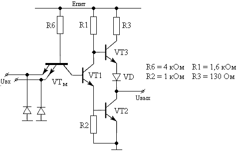 При подаче на вход сложного инвертора высокого уровня напряжение отпирается и насыщается транзистор VT1, отпирается транзистор VT2, а транзистор VT3 запирается. Его запирание обеспечивает диод VD. При этом на выходе логического элемента будет низкий уровень напряжения (логический 0).