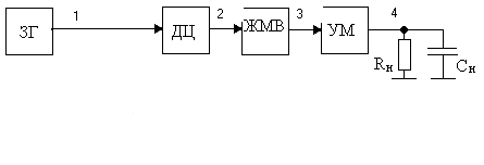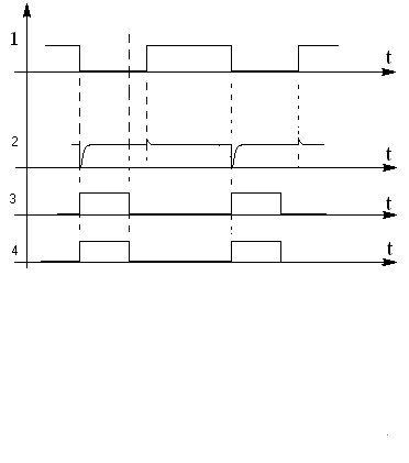 Задающий генератор (мультивибратор автоколебаний) формирует на выходе (точка 1) импульсы прямоугольной формы. К выходу подключается дифференцирующая цепь (ДЦ). Её назначение: создать на своих выходах (точка 2) короткие импульсы, которыми затем будет запускаться ждущий мультивибратор (ЖМВ). ЖМВ формирует на своём выходе основной импульс, длительность которого меняется от Tи min до Tи max (точка 3). Т.к. Л.Э. не в состоянии обеспечить в нагрузке необходимую мощность, то к выходам ЖМВ подключен усилитель мощности (УМ). Он усиливает амплитуду выходного сигнала до нужной величины.