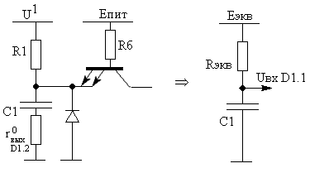 момент начала заряда С1 напряжение на входе D1.1 равно логическому нулю, значит ток, текущий через конденсатор будет складываться из тока, текущего через R1 и входного тока D1.1. В соответствии с этим начертим эквивалентную схему(Рис 5):