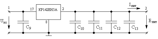 апряжение аРа на входе стабилизатора возьмём равным 10 В. Т.к. напряжение в сети может меняться на 20%, то напряжение на входе стабилизатора будет меняться от 8 до 12 В. Конденсатор С9 должен обеспечить сглаживание пульсации напряжения на входе