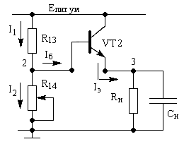 огда в точке 1 (см рис 12а) напряжение логического нуля транзистор VT1 закрыт (т.к. напряжение между базой и эмиттером меньше чем 0.7 В). Потенциал базы VT3 больше, чем эмиттера VT3 тоже закрыт. Конденсатор Cн заряжается через открытый транзистор VT2. Перечертим схему, приведённую на рис 12 и найдём сопротивления R13 и R14: рассмотрим статический режим работы схемы (рис 13)