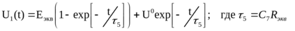 ЖМВ запускается перепадом напряжения в точке 2 (см рис 9а) от U1 до U0. Этот запускающий импульс приходит с выхода ДЦ1. При этом конденсатор начинает заряжаться и когда напряжение в точке 1 достигнет значения U* оба Л.Э. окажутся в области активных характеристик, в схеме возникнет глубокая положительная обратная связь, приводящая к скачку токов и напряжений (см рис 9б). Произойдёт «опрокидование» ЖМВ и снова наступит ждущий режим. Длительность времени Tи характеризуется временем заряда конденсатора. Т.к. в момент заряда конденсатора в точке 1 логический нуль, то конденсатор будет заряжаться не только током текущим через резистор, но и входным током Л.Э. D1.4. Начертим эквивалентную схему заряда конденсатора и найдём время Tи (обозначим Rобщ = R9 + R10):