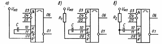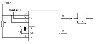 Сигнал сброса, т. е. окончания импульса в триггере, формируется с помощью RC-звена: времязадающий конденсатор C подключается между выводами микросхемы 10 и 11, резистор R включается от вывода 09 к положительной шине питания 5В.