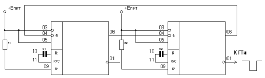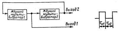 Структурная схема приведена на рисунке: два ждущих мультивибратора соединены так, что выход первого подключен ко входу второго, а выход второго ко входу первого.