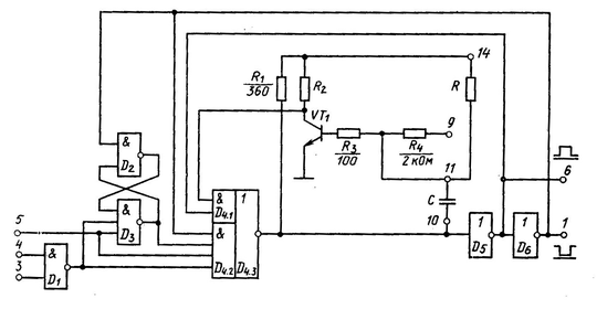 Микросхема К155АГ1— одноканальный ждущий мультивибратор. Он формирует калиброванные импульсы с хорошей стабильностью длительности. Мультивибратор содержит внутреннюю ячейку памяти — триггер с двумя выходами 6 и 1. Поскольку оба выхода имеют наружные выводы , разработчик получает от микросхемы парафазный сформированный импульс. Триггер имеет три импульсных входа логического управления (установки в исходное состояние) через элемент Шмитта. Вход 05 (активный перепад —