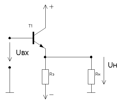 пределим величину нагрузочного сопротивления, при которой схема будет давать максимальную неискаженную мощность. При отрицательном напряжении на выходе повторителя через резистор нагрузки Rн будет протекать часть тока, проходящего через резистор Rэ. Максимального отрицательного значения ток в нагрузке достигнет в том случае, когда ток через транзистор станет равным нулю.