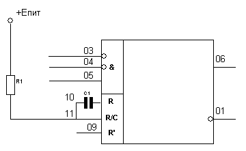 Сигнал сброса, т. е. окончания импульса в триггере, формируется с помощью RC-звена: времязадающий конденсатор C подключается между выводами микросхемы 10 и 11, резистор R включается от вывода 09 к положительной шине питания 5В.
