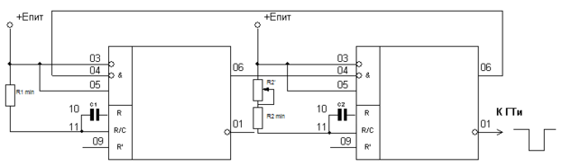 Мультивибратор (ГТ) генерирует прямоугольные импульсы с регулируемым периодом следования для запуска ждущего мультивибратора