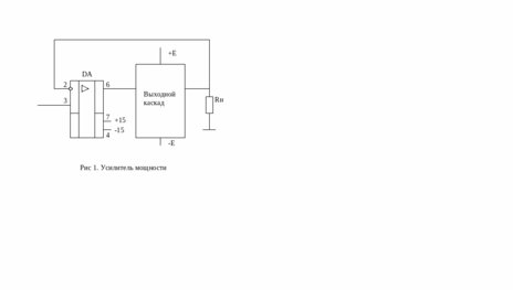 Операционный усилитель DA обеспечивает заданное значение напряжения на нагрузке, а усилитель мощности как правило имеет коэффициент Ku1 и усиливает сигнал ОУ по току и, следовательно, по мощности. В тех случаях, когда выходное напряжение ОУ меньше Uнm, выходной каскад должен иметь Ku1, и для этого содержать транзисторы, включенные по схеме ОЭ.