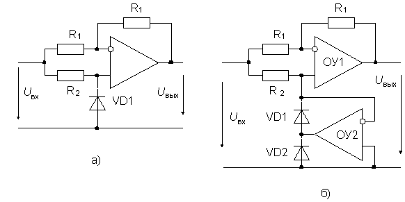 Во многих устройствах обработки аналоговых сигналов, например, в измерительных схемах, необходимо выделение либо составляющих только одной полярности (однополупериодное выпрямление), либо определение абсолютного значения сигнала (двухполупериодное выпрямление). Эти операции могут быть реализованы на пассивных диодно-резистивных цепях, но значительное прямое падение напряжения на диодах (0,5 – 1 В) и нелинейность его вольт-амперной характеристики вносят в этом случае значительные погрешности, особенно при обработке слабых сигналов. Применение ОУ позволяет в значительной степени ослабить влияние реальных характеристик диодов.