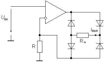 Двухполупериодные выпрямители. Наиболее просто реализуются прецизионные двухполупериодные выпрямители с незаземленной нагрузкой, например, стрелочным миллиамперметром. Схема такого устройства приведена на рис. 29. Здесь операционный усилитель служит в качестве управляемого по напряжению источника тока. Поэтому выходной ток не зависит от падения напряжения на диодах и сопротивления нагрузки Rн.