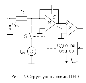 На базе преобразователей напряжение-частота (ПНЧ) могут быть построены интегрирующие АЦП, обеспечивающие относительно высокую точность преобразования при низкой стоимости. Существует несколько видов ПНЧ. Наибольшее применение нашли ПНЧ с заданной длительностью выходного импульса. Структурная схема такого ПНЧ приведена на рис. 17. По этой схеме построена ИМС VFC-32 (отечественный аналог - 1108ПП1).