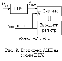 Таким образом, по существу ПНЧ преобразует входное напряжение в унитарный код. Для его преобразования в двоичный позиционный можно использовать счетчик. Схема интегрирующего АЦП на базе ПНЧ приведена на рис. 18. Двоичный счетчик подсчитывает число импульсов, поступивших от ПНЧ за период Тотсч=1/fотсч, задаваемый отсчетными импульсами, которыми содержимое счетчика заносится в выходной регистр-защелку. Вслед за этим происходит обнуление счетчика. Число импульсов n, подсчитанных счетчиком за время Тотсч,