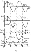 времени T/2 - Т) потенциал точки b выше потенциала точки а, диоды VD2,VD4 открыты, а диоды VD\, VD3 закрыты. В оба полупериода, как №о из рис. 5.4,6, ток через нагрузочный резистор RH имеет одно и тоже направление. Анализ временных диаграмм позволяет получить выражения для средних значений выпрямленных напряжений и токов:
