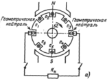 Обмотка якоря представляет собой замкнутый контур. Однако ток в контуре не возникает, так как алгебраическая сумма мгновенных значений ЭДС всех последовательно соединенных проводников обмотки равна нулю: обмотка выполняется с равным количеством проводников под каждым полюсом, магнитные потоки полюсов одинаковы, полярность полюсов чередуется. Если установить неподвижные щетки для осуществления скользящего контакта с проводниками, проходящими геометрические нейтрали, то между щетками всегда будут находиться проводники обмотки с одинаково направленными ЭДС, сумма которых максимальна и постоянна.