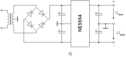 Значительно более удобным оказывается применение специальных схем стабилизаторов для отрицательной полярности напряжения, например, mА79xx или 1168ЕНхх. Для случаев, когда требуется два симметричных относительно общей точки стабилизированных напряжения ( например, +/-15 В для питания операционных усилителей) выпускаются ИМС, содержащие два стабилизатора - на положительное и отрицательное напряжение, например, NE5554 (отечественный аналог - КР142ЕН6). Упрощенная схема внутренней структуры такого стабилизатора приведена на рис. 4а, а схема включения - на рис. 4б.