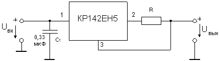 На резисторе R падает напряжение, равное номинальному выходному напряжению стабилизатора. Это составляет для КР142ЕН5 около 5 В, что приводит к большим потерям энергии в резисторе. Поэтому в такой схеме целесообразно использовать ИМС регулируемого стабилизатора, например, КР142ЕН12, у которого, при указанной схеме включения, это напряжение составит 1,2 В.