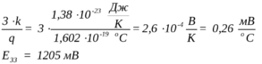 , где ЕЗЗ - энергетическая ширина запрещенной зоны при абсолютном нуле (0 К), полученная линейной экстраполяцией от комнатной температуры (300 К) к абсолютному нулю, ЕЗЗ = 1,205 В = 1205 мВ.