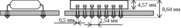 2. Корпус dip – dual in line package, – в две линии расположенные выводы (иногда этот тип корпуса называют DIL, иногда, чтобы указать, что корпус изготовлен из пластмассы – PDIP, plastic DIP), – корпус микросхемы, у которой обозначение корпуса начинается с цифры 2; выводы числом от четырнадцати до сорока двух с двух сторон микросхемы с шагом обычно 2,5 мм, изогнутые под углом 900 , припаиваются только в отверстиях печатных плат.