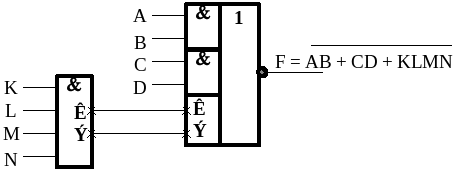 Рис. 7.2.2. Условные графические обозначения расширителя по ИЛИ и логического элемента 2И–2ИЛИ–НЕ, “нелогические” выводы которых, отмечены наклонными крестами