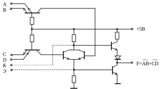 Если входные многоэмиттерные транзисторы таких микросхем имеют по несколько входов И, то получается схема логического элемента ЛР, – И–ИЛИ–НЕ, очень распространенная в ТТЛ (в ТТЛ сериях выпускается тринадцать типов логических элементов И–ИЛИ–НЕ).