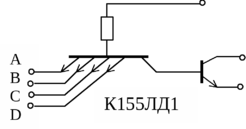 Такое подключение снижает быстродействие и помехоустойчивость микросхемы по И входу, к которому подключены внешние диоды. Статическая помехоустойчивость ТТЛ микросхем составляет 0,4 В. При подаче на один из дополнительных внешних диодов уровня логического нуля падение напряжения на этом открытом диоде практически полностью скомпенсирует напряжение статической помехоустойчивости, поэтому любая помеха при нуле на входе может привести к ложному срабатыванию.