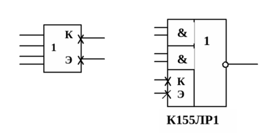 В некоторых видах этих микросхем И–ИЛИ–НЕ точки соединений коллекторов и эмиттеров подведены к выводам микросхемы, как показано на рис. 7.2.1 пунктирными линиями, что позволяет подключать дополнительные входные каскады с целью расширения по ИЛИ. При изображении логического элемента И–ИЛИ–НЕ или расширителей с выходами коллектор и эмиттер эти выводы отмечают наклонными крестами (см. рис. 7.2.2), в отличие от логических выводов. На обозначенных крестами выводах микросхем потенциалы могут отличаться от уровней, заданных требованиями для логических уровней.