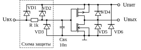 Эта цепь защищает вход инвертора от пробоя, резистор защищает выход предыдущего каскада от импульсной токовой перегрузки при заряде емкости Cвх. Диоды D1, D2 и D3 изготовлены таким образом, что напряжение пробоя их в обратном включении составляет 25…50 В, и при сигналах на входе логического элемента, превышающих напряжение пробоя, эти диодные стабилитроны открываются и предохраняют входы полевых транзисторов от высоковольтных выбросов, которые могут привести к пробою изоляции между затвором и каналом полевого транзистора.
