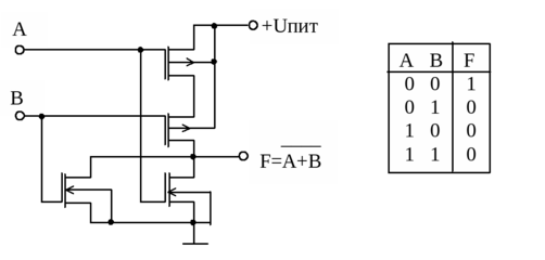 Если на входах A или B (или на обоих) логическая единица, то откроется один или оба из нижних транзисторов, при этом закроется один или оба верхних транзистора, тогда на выходе логический ноль. Если на обоих входах логический ноль, то закроются оба нижних и откроются оба верхних транзистора, при этом на выходе логическая единица.