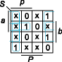 Первый метод основан на использовании значения выходного переноса P как вспомогательной переменной при определении выходной суммы S (табл. 4). В табл. 4 при наборах переменных, являющихся нереальными (например, единичное значение переноса при нулевых значениях всех входных переменных), поставлены безразличные значения (крестик) для функции S, которые можно доопределять произвольным образом.