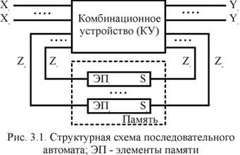 В общем виде, последовательностный автомат рассматривается состоящим из двух частей: комбинационного устройства (КУ) и памяти, состоящей из элементов памяти (ЭП) (рис. 3.1).