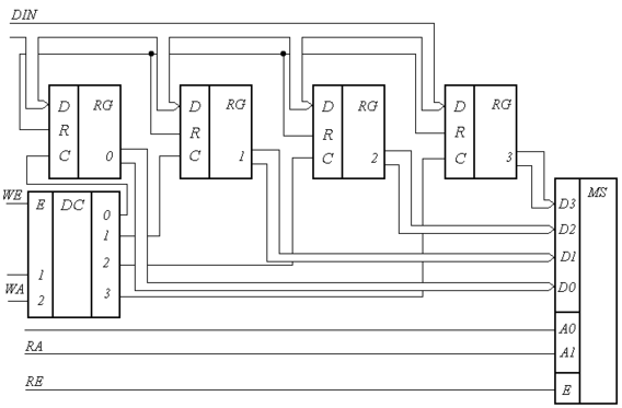 Вход загрузки требуемого регистра выбирается дешифратором записи DC на основании адреса записи WA , т. е. кода номера загружаемого регистра. Запись данных, присутствующих на шине DIN, происходит в момент поступления сигнала разрешения записи WE. Выходы регистров мультиплексором MS подключаются к выходной шине DOUT. Номер регистра, с которого происходит чтение, определяет код адреса чтения RA . Выдачу данных в шину DOUT разрешает сигнал RE. Поскольку дешифрация адреса записи и адреса чтения производится двумя независимыми узлами, имеющими автономные адресные входы WA и RA , регистровая память может одновременно записывать число в один из регистров и читать число из другого.