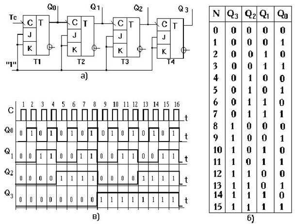 Рис. 3.33. Схема а), таблица состояний триггеров б) и временные диаграммы, поясняющие работу в) последовательного четырехразрядного счетчика на