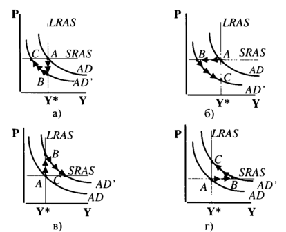 Г), в результате резкого повышением скорости обращения денег в экономике (y = M*V/ P )произошло увеличение совокупного спроса (AD2 -> AD2), и краткосрочное равновесие установилось в точке В, где У>У*, а уровень цен остался неизменным. Под влиянием высокого уровня спроса увеличивается объем производства, но некоторое время продукция реализуется по старым ценам. Однако постепенно начинают расти издержки: при отсутствии достаточного количества свободных ресурсов и росте спроса на них увеличивается их цена, например растет заработная плата. Это ведет к росту цен на готовую продукцию. Величина спроса в результате начинает снижаться (движение вдоль кривой AD2 от точки В к точке С), и экономика возвращается к прежнему уровню выпуска, но при более высоком уровне цен. Долгосрочное равновесие устанавливается в точке С.