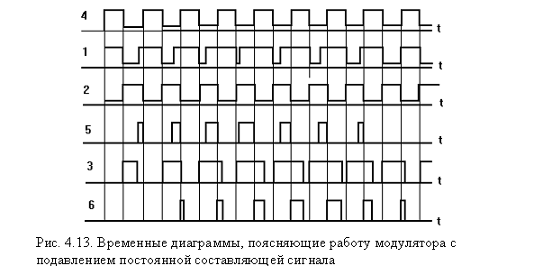 Временные диаграммы, иллюстрирующие принцип работы модулятора с подавлением постоянной составляющей, представлены на рис. 4.13.
