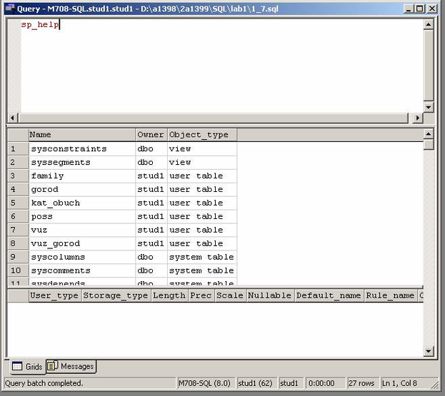 Если все эти команды будут выполнены без ошибок, то с помощью команды sp_help можно вывести список названий всех созданных таблиц (см. рис. 4).