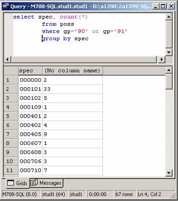 1) выполнить запрос с условием выборки по году окончания (значение '96'), используя в списке выборки агрегатную функцию count(*), предназначенную для подсчета общего количества записей по запросу;
