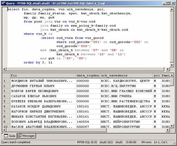 Поэтому в списке выборки запроса для полей учебное заведение, семейное положение и категория обучения должны быть указаны составные имена (т.е. с именем таблицы), в предложении from должны быть записаны четыре имени таблиц, а в предложении where для поля код учебного заведения должны быть использованы функция IN и подзапрос, а также должны быть указаны три условия соединения таблиц (таблицы poss с таблицей vuz по полю код учебного заведения; таблицы poss с таблицей family по полю код семейного положения; таблицы poss с таблицей kat_obuch по полю код категории обучения).