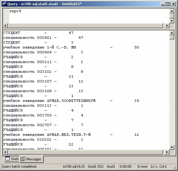 print 'специальность ' + @sp + ' - ' + str(@it2) /* печать последнего итога по специальности */