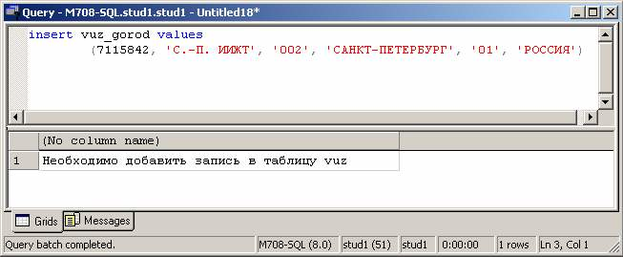 Чтобы проверить срабатывание этого триггера, необходимо ввести оператор insert для таблицы vuz_gorod, например: