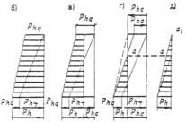 Если значение рh, оказывается меньше нуля (черт. 1, г), то на этом участке принимается рh = 0. При этом следует давление на глубине h сохранить равным рh, а вершину суммарной треугольной эпюры давления грунта из точки а перенести в точку а1 на поверхности (черт. 1, д).