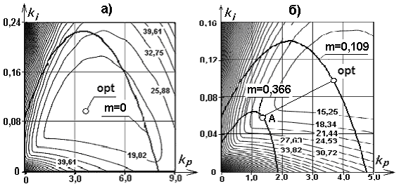 На рис. 3 показаны две плоскости параметров ПИ-регулятора. На плоскость параметров нанесены линии равных уровней оптимизируемой функции - значений интеграла по модулю (значения показаны цифрами на линиях). Оптимизируемая функция – интеграл по модулю имеет один экстремум opt с координатами kp=3,66 и ki=0,1, где значение интеграла Imod=12,2.