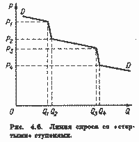 Кривая спроса со “стертыми” ступенями объясняет стабильность (“липкость”) цен, когда цены многих других товаров изменяются. Повышение цены с P 3 до P 2 приведет к сокращению спроса почти в 2 раза, тогда как ее снижение с P 3 до P 4 дает ничтожно малый его прирост. Спрос на данный товар может оказаться весьма эластичным при повышении цены, но почти неэластичным при ее снижении (или наоборот).