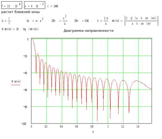 Рассчитать и построить график функции направленности излучения и приема преобразователя с круглой пластиной, имеющего следующие параметры: