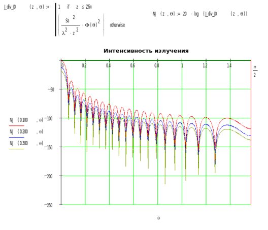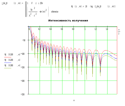 поле излучения представляется в виде расходящегося пучка лучей. Распределение интенсивности излучения (или амплитуды P) по узлу в этой зоне называют диаграммой направленности преобразователя. Распределение интенсивности излучения, как следует из [2] , может быть рассчитано по формуле