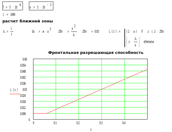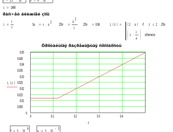 Формулы (3) и (4) дают возможность построить график функции изменения разрешающей способности l дефектоскопа с глубиной z для конкретного преобразователя.