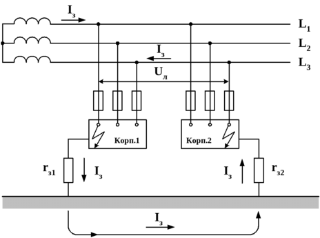 При двойном замыкании на землю в сети с изолированной нейтралью напряжением до 1000 В, то есть замыкании двух фаз на два корпуса, имеющие раздельные заземлители (рис.3), эти и другие корпуса, присоединенные к указанным заземлителям, окажутся под напряжением относительно земли, равным: в установке 1 - Uз1= Iзrз1, в установке 2 - Uз2 = Iзrз2.